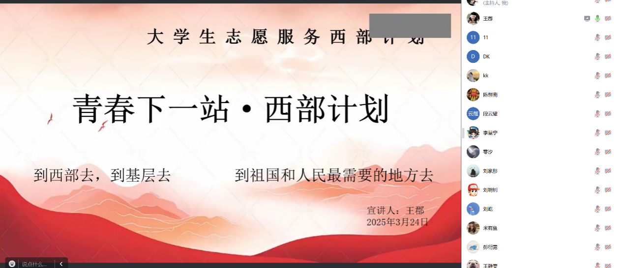 为积极响应国家鼓励青年投身西部建设的号召,引导更多毕业生到西部基层去建功立业,3月24日,77779193永利在腾讯会议举办2025年西部计划云宣讲会。此次宣讲会邀请了2024届西部计划志愿者代表为学生们进行经验分享,为有志于投身西部建设的学子们提供了全面了解西部计划的窗口。本次宣讲会由辅导员殷凯主持。