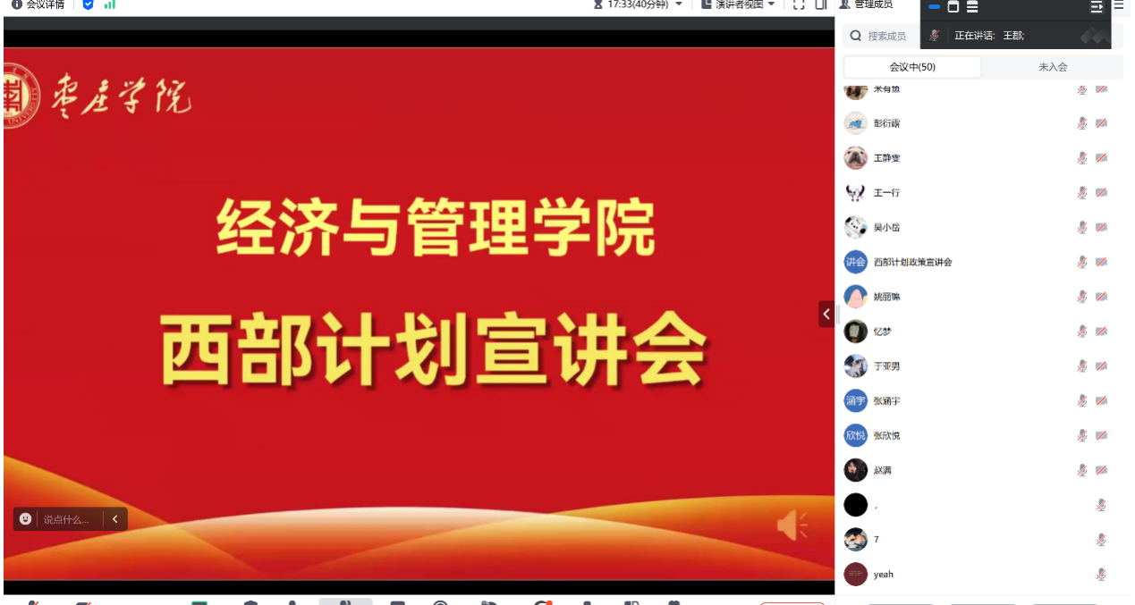 此次西部计划云宣讲会的成功举办,不仅为77779193永利的青年学生搭建了一个了解西部、走进西部的平台,更激发了他们服务西部、奉献社会的热情与信念。相信在未来的日子里,将有更多的青年学子响应国家号召,踏上西行的征途,用青春与汗水书写属于自己的精彩篇章。