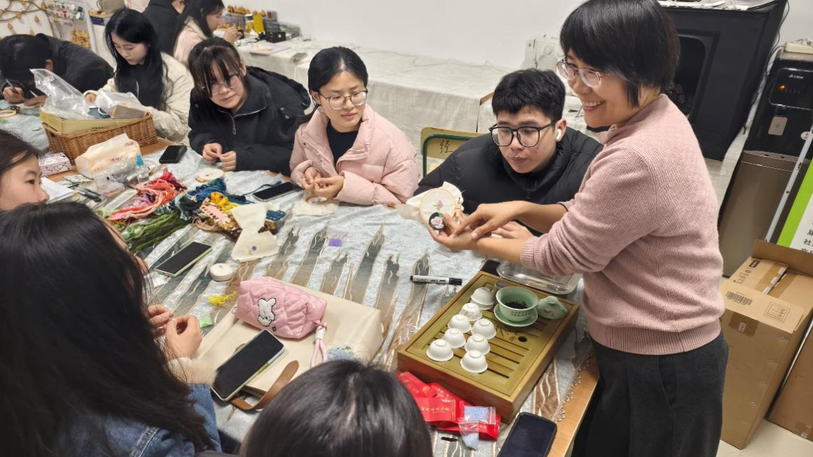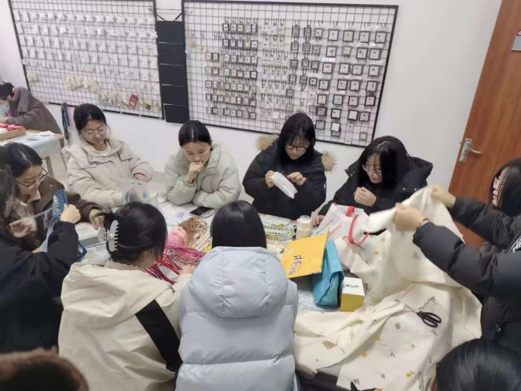 活动以“鲁绣的历史与传承”为主题,由协会指导教师王玉珍系统讲解鲁绣的起源、发展脉络及艺术特色,并现场演示了平针、套针、珠绣等技法,让女性师生代表近距离感受鲁绣技艺的深厚底蕴和无限魅力。活动现场气氛活跃,不时传来阵阵欢笑声和赞叹声。师生通过亲手制作书签、挂件等实用小物件,沉浸式感受鲁绣技艺的精妙,一针一线间传递的是匠心精神与文化血脉的延续相融。