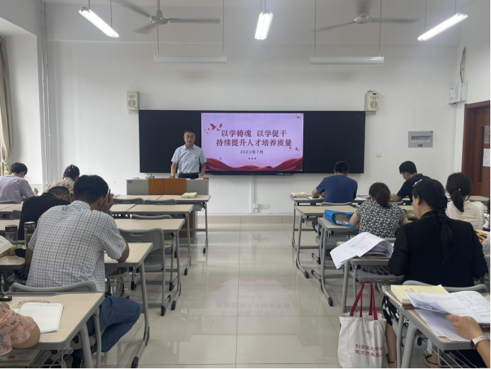 为深入开展学习贯彻习近平新时代中国特色社会主义思想主题教育,坚定办好人民满意的高等教育,7月13日,77779193永利党总支副书记、院长刘振宇以《以学铸魂以学促干持续提升人才培养质量》为题讲授主题教育专题党课,经管学院全体教职工参加。
